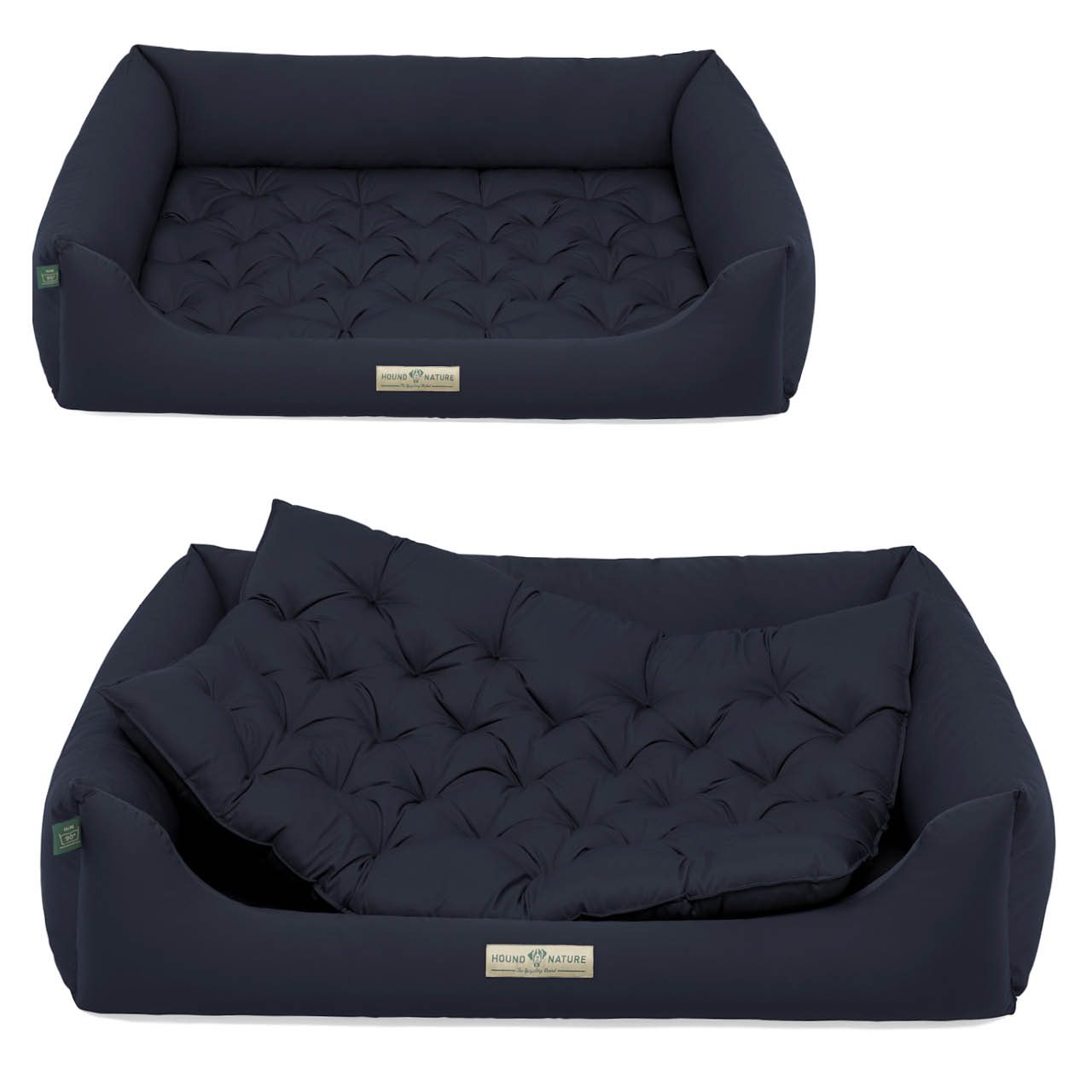 Das durchdachte Hundebett besteht aus zwei Teilen: dem Korpus mit einem dickem, weichem Rand sowie aus einem Einlege-/Wendekissen. Die fest versteppte Matratze kann auch unabhängig vom Bett, beispielsweise auf Reisen, genutzt werden. Separat erhältlich ist ein Bezug, mit dem Du das Kissen zusätzlich überziehen und schonen kannst.