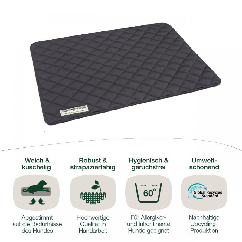 Die nachhaltige Hundedecke „Davos“ in Grau von HOUND & NATURE ist nicht nur waschbar, sondern auch strapazierfähig und mit vielen praktischen Funktionen ausgestattet. Sie eignet sich für allergische Hunde, weil die Füllung keinen Nistplatz für Milben bietet. Auch inkontinente Hunde liegen darauf gut, weil der extrem dich gewebte Stoff aus Baumwoll-Gemisch wasserabweisend ist. Sie ist auch wendbar – also gleichwertig auf beiden Seiten. Die stabile Versteppung garantiert eine robuste und langlebige Oberfläche. Innen besteht die Hundedecke aus isolierender Thermopolsterung aus Recycling-Polyester und außer aus weichem Baumwollgemisch-Reststoff.