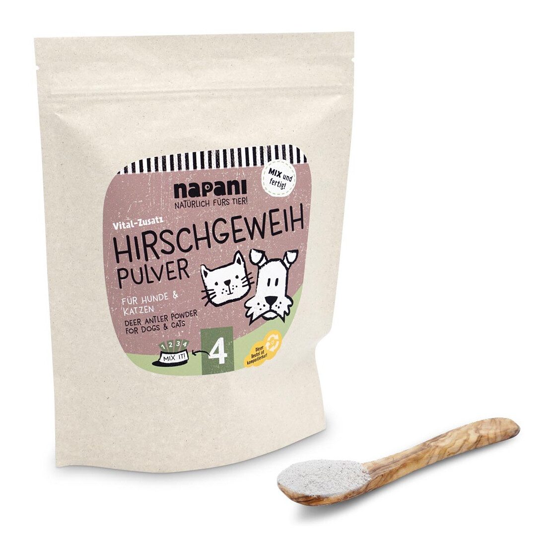 Mineralien für Hunde und Mineralstoffe für Katzen sind für ein gesundes Leben einfach unerlässlich. Das Hirschgeweihpulver von napani bringt Deinem Hund und Deiner Katze Mikronährstoffe direkt aus der Natur. Es stammt von Abwurfgeweihen des österreichischen (Gehege-)Rotwilds und ist ein naturreines, hoch bio-verfügbares Ergänzungsfuttermittel, geeignet als wertvoller Zusatz für alle Ernährungsformen – Dosen, Trockenfutter oder Rohfleischfütterung (BARF). Das feine Pulver eignet sich hervorragend für eine Mineralstoffversorgung Deines Haustieres auf rein natürlicher Basis.